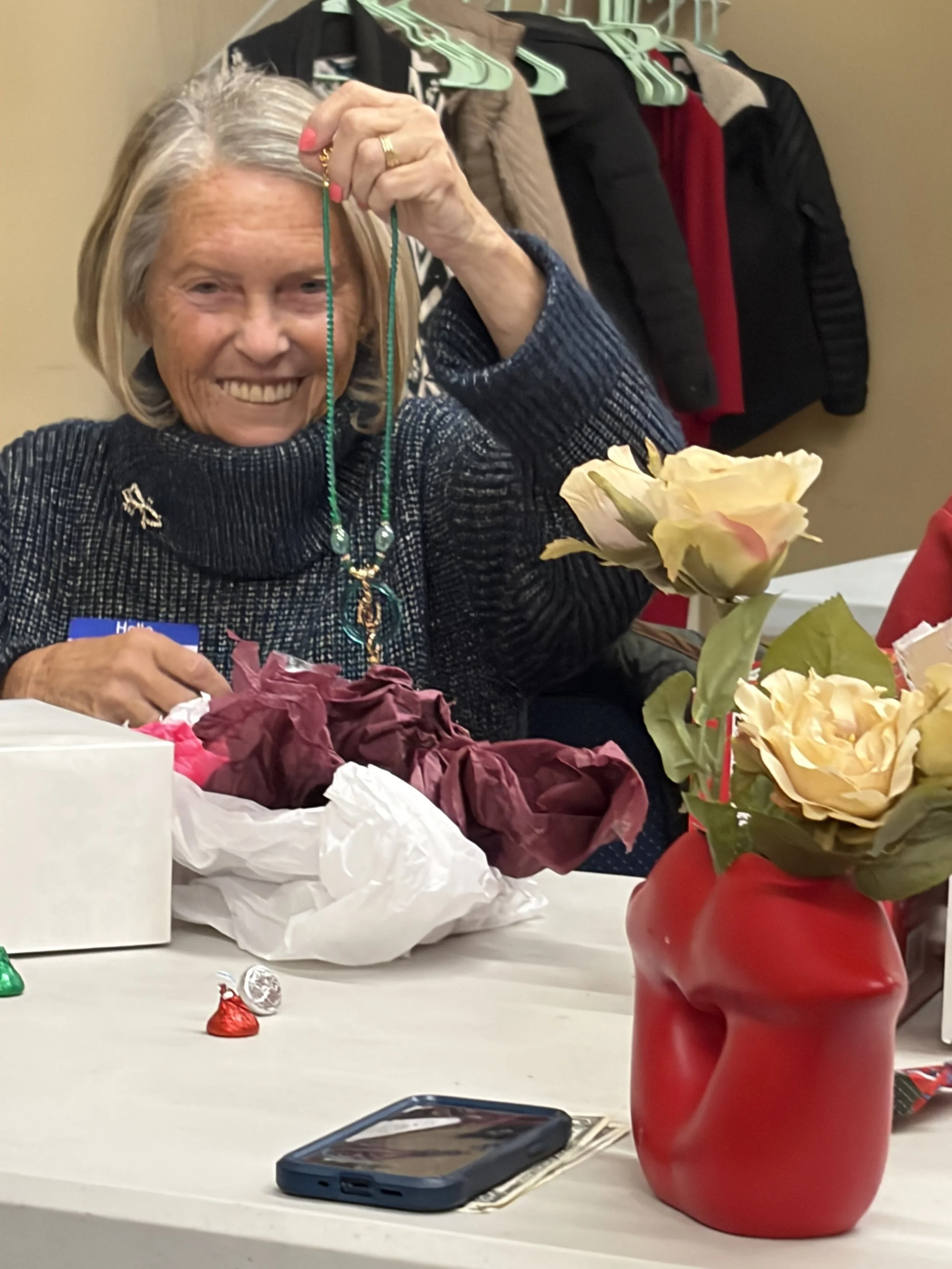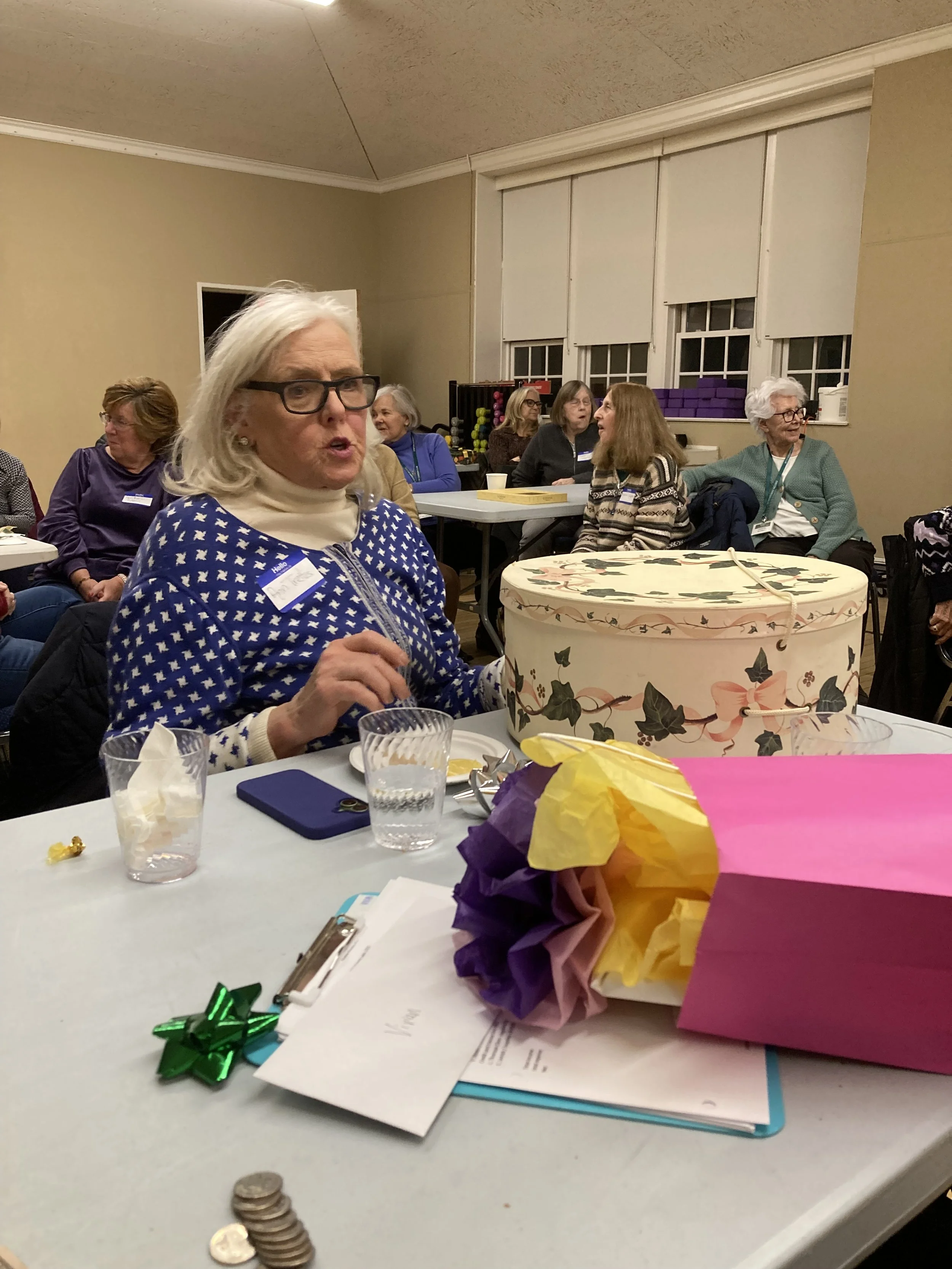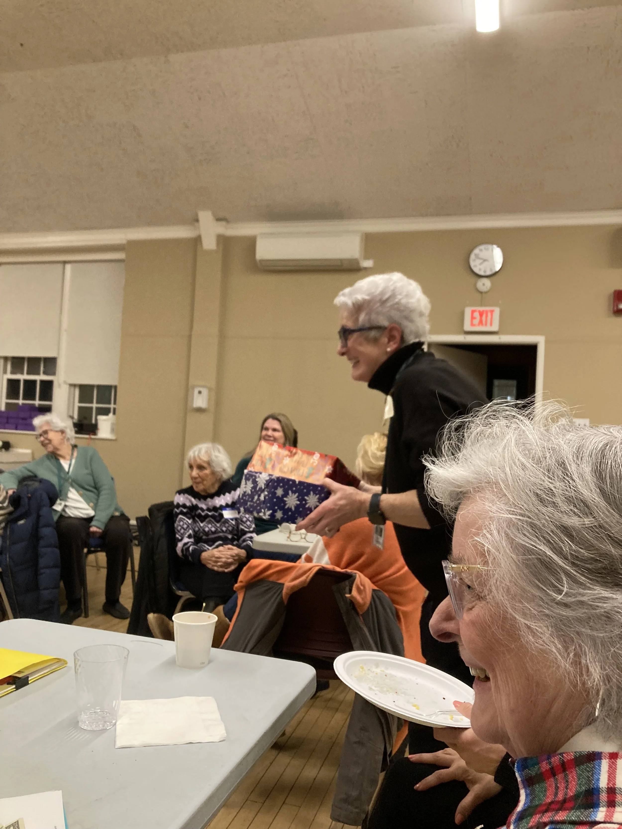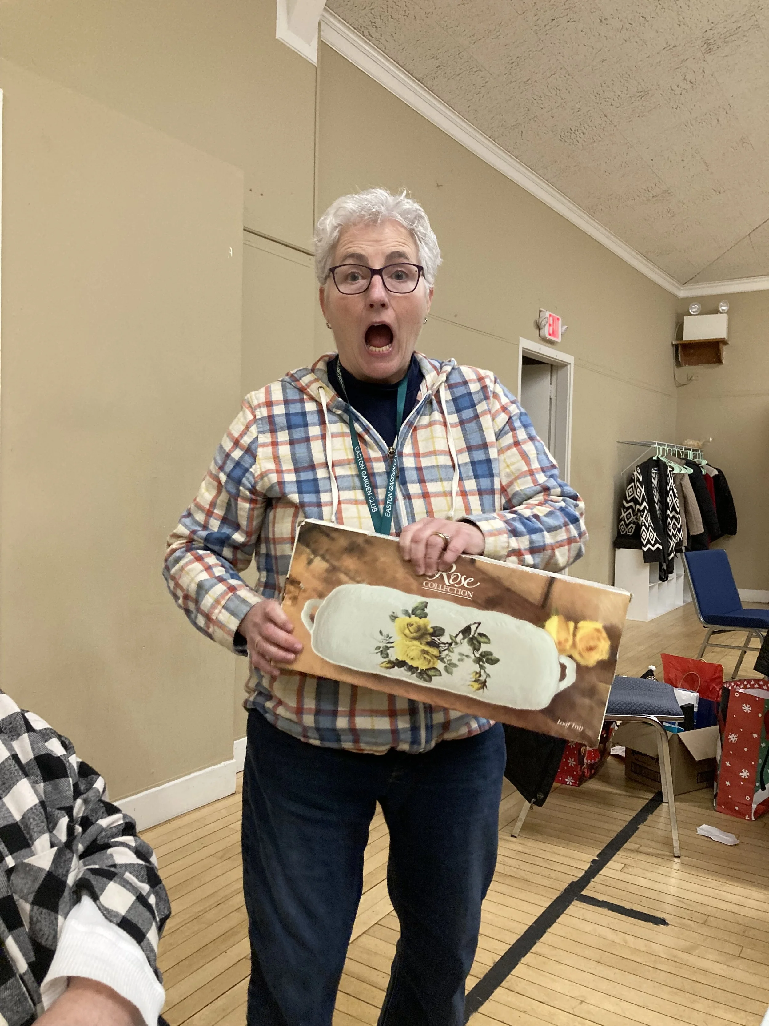 The January members-only meeting is always a fun time! Pizza, salad, and a lively auction of regifted and/or joke gifts. Here are a few highlights of the meeting and some members’ expressive reactions.